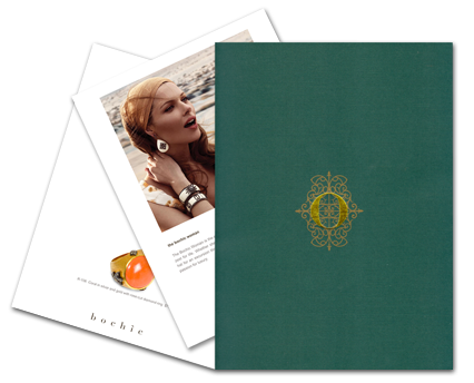 The business cards are designed on more traditional green linen paper, kissed with a gold foil stamp. The interior pages consist of the bold colorful images of bochic's jewelry, against a clean, white layout. A combination of ornate details and modern touches.