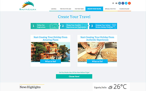 L’obiettivo è creare una pagina web integrata nella nuova identità del marchio Beatiful Liguria, che si propone come un’agenzia non convenzionale, agile, online, che offre servizi e prodotti customizzabili e particolari, frutto di una profonda ricerca mossa dalla passione per la belleza di un territorio.